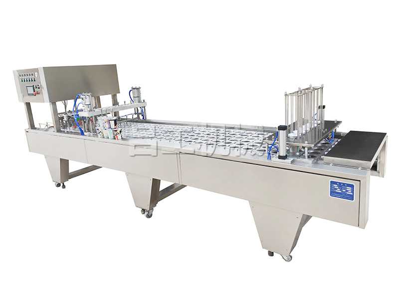 本機(jī)采用合理的機(jī)械傳動(dòng),功能齊全,灌裝、封口、切邊、制品推出,廢料收卷,印碼等自動(dòng)化工作,可節(jié)約人力,降低成本。本機(jī)有二次熱封裝置,料杯/碗/盒與封膜經(jīng)過(guò)前后二次熱封,封口牢固可靠。