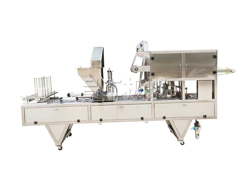 本機(jī)采用合理的機(jī)械傳動(dòng),功能齊全,灌裝、封口、切邊、制品推出,廢料收卷,印碼等自動(dòng)化工作,可節(jié)約人力,降低成本。本機(jī)有二次熱封裝置,料杯/碗/盒與封膜經(jīng)過(guò)前后二次熱封,封口牢固可靠。
